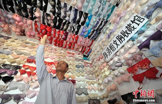 [國內(nèi)新聞]4月21日,海南省三亞市崖城鎮(zhèn)的陳清祖花費(fèi)20年時間收集5000余件文胸,在一間棟不起眼小房間的墻壁上、天花板上掛滿了各式各樣的女性文胸,數(shù)量多達(dá)5000余件,而這些令人目不暇接的“藏品”來自全國30多所高校的女生。據(jù)陳清祖介紹,他的夢想是將來打造一間文胸收藏館,通過展示內(nèi)衣,提高全社會對女性乳房健康的關(guān)注度。圖為陳清祖展示他的“特別藏品”。