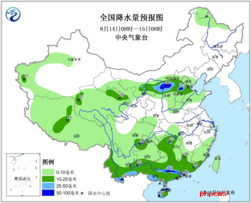 圖3 全國降水量預(yù)報圖(8月14日08時—15日08時)