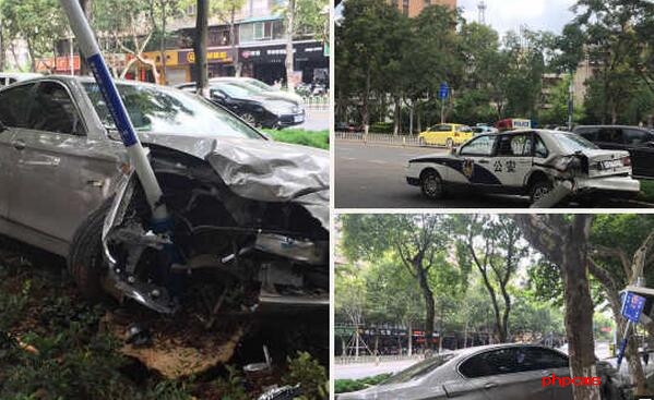 8月12日清晨7時(shí)40分時(shí),昆明市環(huán)城西路與氣象路交叉口,一輛寶馬車突然撞向兩輛停在路邊的巡邏警車,又沖上綠化帶撞倒監(jiān)控桿,最后撞上行道樹才停了下來。所幸,沒有造成人員傷亡。